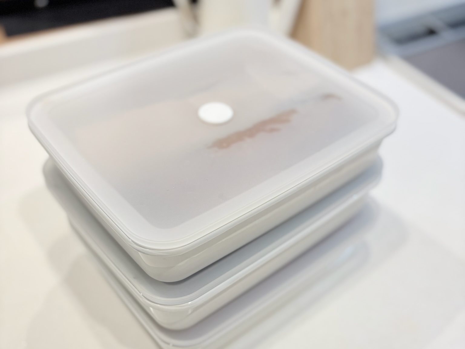 | プラスチックは蓋のパッキン部分のみ。 重量はありますが、冷蔵庫に入るサイズで◎ | |
